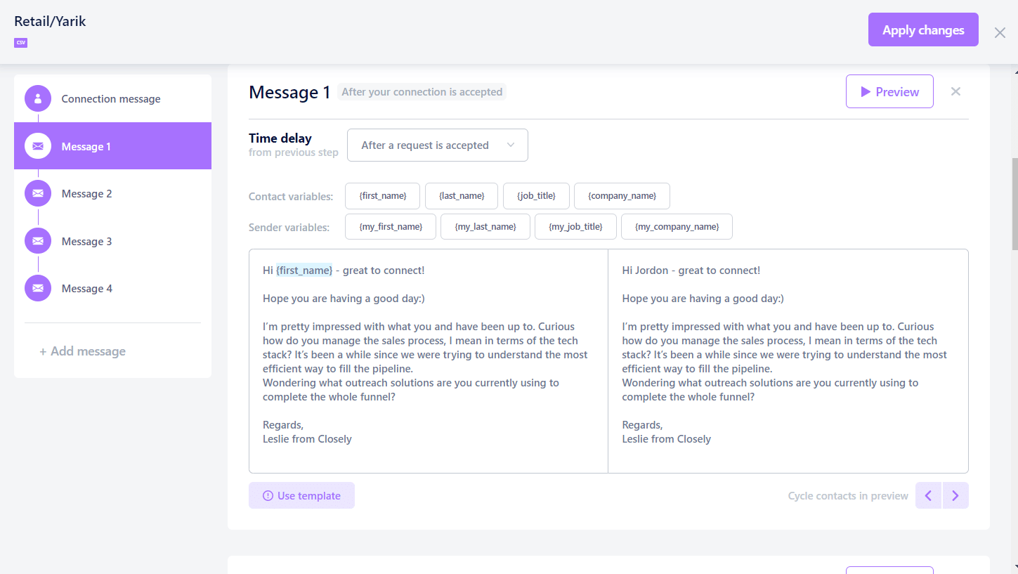 Just after the obvious time-saving advantage, Closely offers another extremely useful functionality – personalization. It offers to use variables to make your message sound personalized rather that robotic.