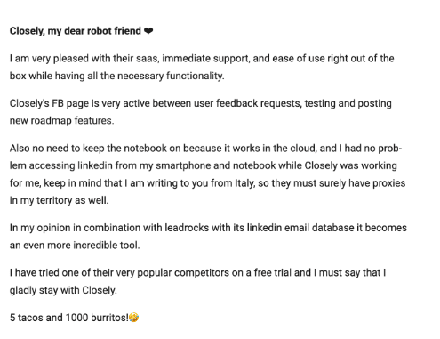 So, in a few words, it’s the safest tool on the market. You can join the community for B2B sales fans and founders on Facebook and ask real users. They all use Closely 😊😊
